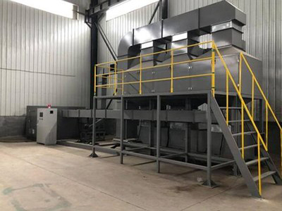 廢氣催化燃燒設(shè)備脫附后的氣體經(jīng)阻火器、進氣閥、換熱器、電加熱器(預(yù)熱器)升溫,使氣體溫度升至催化燃燒所需要的溫度,在催化床內(nèi)的催化劑的作用下分解成水和二氧化碳,同時放出大量的熱,使氣體溫度進一步提高,高溫氣體再通過換熱器進行部分熱量回收后,通過風(fēng)機排出。