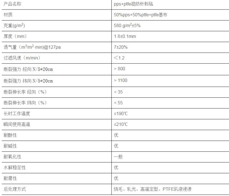 pps+ptfe混紡布袋技術(shù)參數(shù)