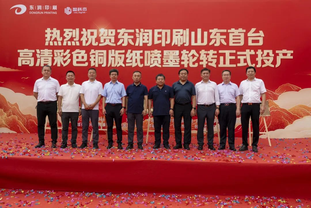 中國印刷及設(shè)備器材工業(yè)協(xié)會副理事長楊民強,國際標準化組織/印刷技術(shù)委員會(ISO/TC130)主席、中國印刷科學(xué)技術(shù)研究院黨委書記、院長趙鵬飛,中國印刷技術(shù)協(xié)會常務(wù)副秘書長、《中國印刷》雜志社社長劉積英,山東省印刷協(xié)會副理事長兼秘書長李寶忠,山東省印刷協(xié)會副理事長、濟南市印刷行業(yè)協(xié)會會長朱震,濟南市夏津商會會長、山東萬華汽車銷售服務(wù)有限公司董事長王玉國,山東盈科杰數(shù)碼科技有限公司總經(jīng)理譚明,濟南東潤印刷有限公司董事長王遠華,民建濟南市委會直屬十六支部主委、山東正諾項目管理有限公司總經(jīng)理王建軍,東莞市雅思機械設(shè)備有限公司總經(jīng)理劉玉智,濟南東潤印刷有限公司總經(jīng)理王遠華等領(lǐng)導(dǎo)與嘉賓們一同走上舞臺,為山東首臺盈科杰高清彩色銅版紙噴墨輪轉(zhuǎn)印刷設(shè)備正式投產(chǎn)揭幕。